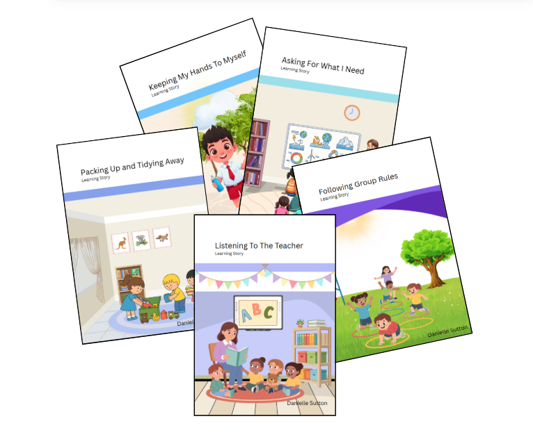 These five learning stories are visual tools that support young children to navigate everyday expectations in school and daycare settings, including listening, packing up, following group rules, asking for help, and keeping hands to themselves. Clear, predictable and child-friendly.